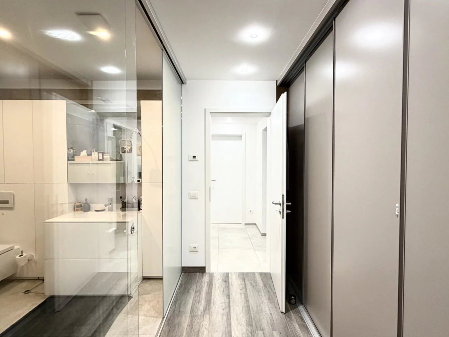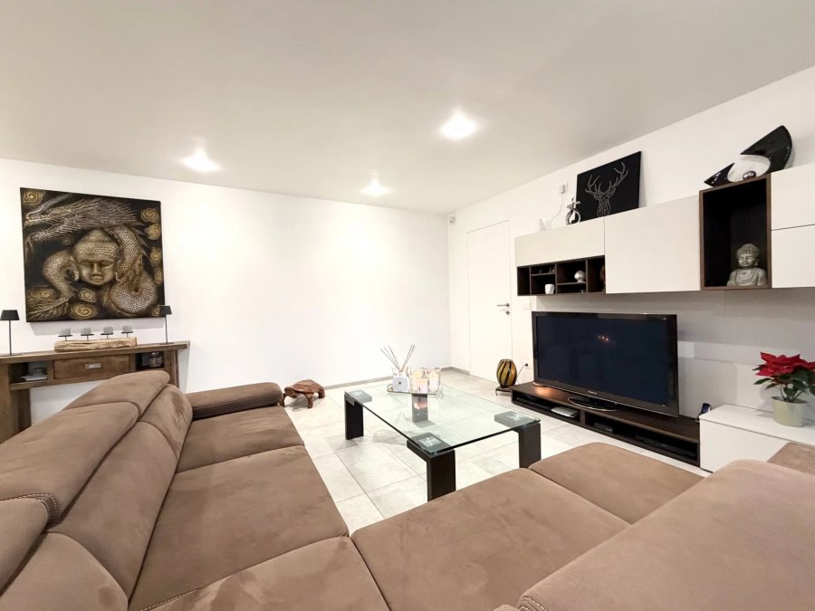 - E Wunnzëmmer mat offener Kichen - E Schlofkummer - E Buedzëmmer mat Badewanne a Toilette - E Master-Suite mat Dusch a Toilette - 2 Balkonen - E Keller - Eng Wäschkammer am Appartement oder gedeelt, no Wënsch - 2 Indoor-Parkplazen - Gedeelt Gaart disponibel Virdeeler: Gebaut am Joer 2015
