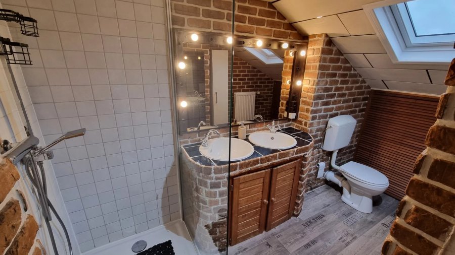 - Une salle de bain avec WC, douche et coin buanderie