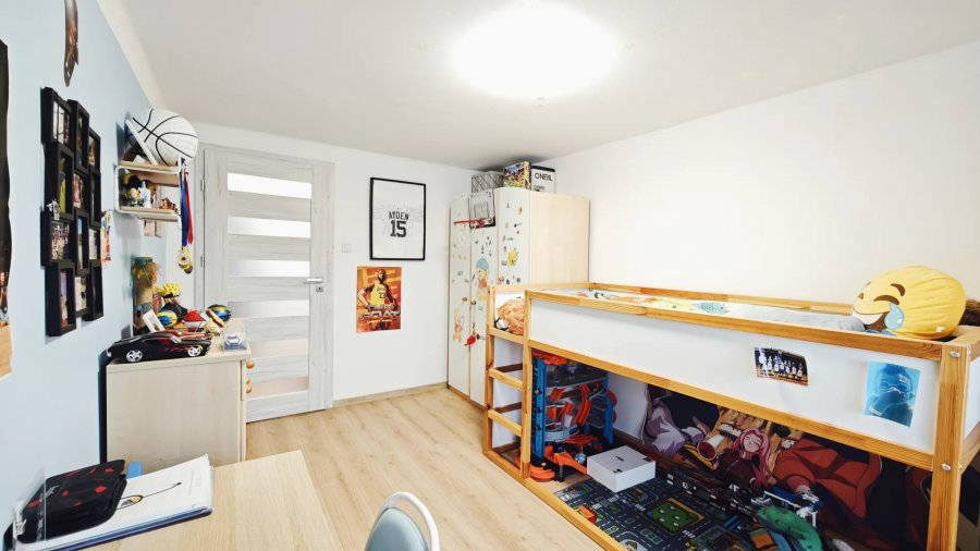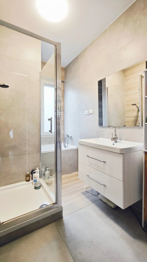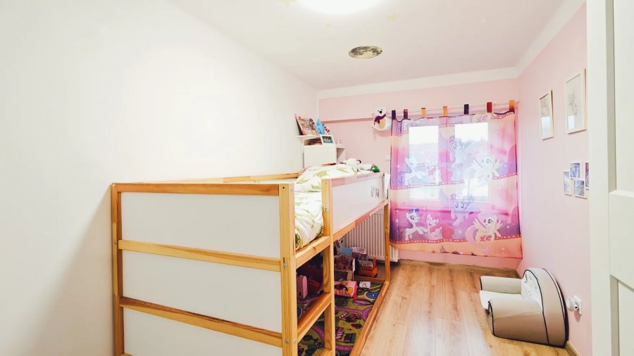 - Separat Kichen mat Iesszëmmer vu 18 m² - Zougang zur Terrass an dem Gaart 1. Stack: - 2 grouss Schlofkummer vu 13 m² an 13,5 m² - Eng Buedzëmmer mat Dusch - 1 separat WC 2. Stack: - 2 Schlofkummer vu 10 m² an 11,5 m²