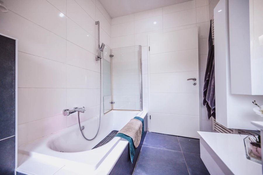 - Bathroom, including washbasin, bathtub, towel dryer, WC, outside window