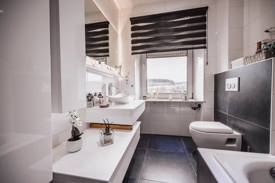 - Bathroom, including washbasin, bathtub, towel dryer, WC, outside window